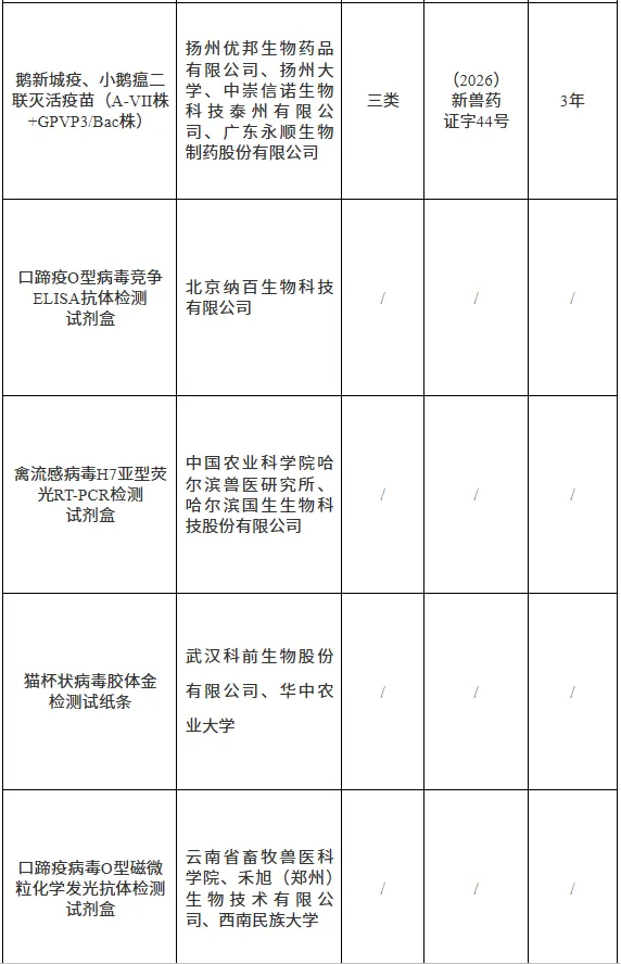 批准口蹄疫O型病毒竞争ELISA抗体检测试剂盒等4种兽药产品注册,发布产品质量标准、工艺规程、说明书和标签,自发布之日起执行。
