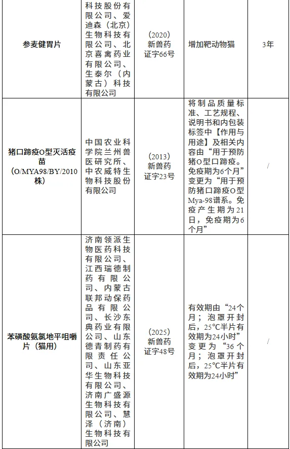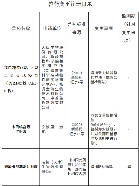 批准猪口蹄疫O型、A型二价灭活疫苗(OHM/02株+AKT-III株)变更注册,发布修订后的质量标准、工艺规程、说明书和标签,自发布之日起执行,此前发布的产品质量标准、工艺规程、说明书和标签同时废止;批准卡贝缩宫素注射液变更注册,发布修订后的质量标准、说明书和标签,自发布之日起执行,此前发布的产品质量标准、说明书和标签同时废止;批准硫酸卡那霉素注射液、参麦健胃片变更注册,发布修订后的说明书和标签,自发布之日起执行,此前发布的产品说明书和标签同时废止;批准猪口蹄疫O型灭活疫苗(O/MYA98/BY/2010株)、苯磺酸氨氯地平咀嚼片(猫用)变更注册,有关单位按照农业农村部批准的变更事项,自行修改原批准的质量标准、工艺规程、说明书和标签对应内容,并印制、使用。