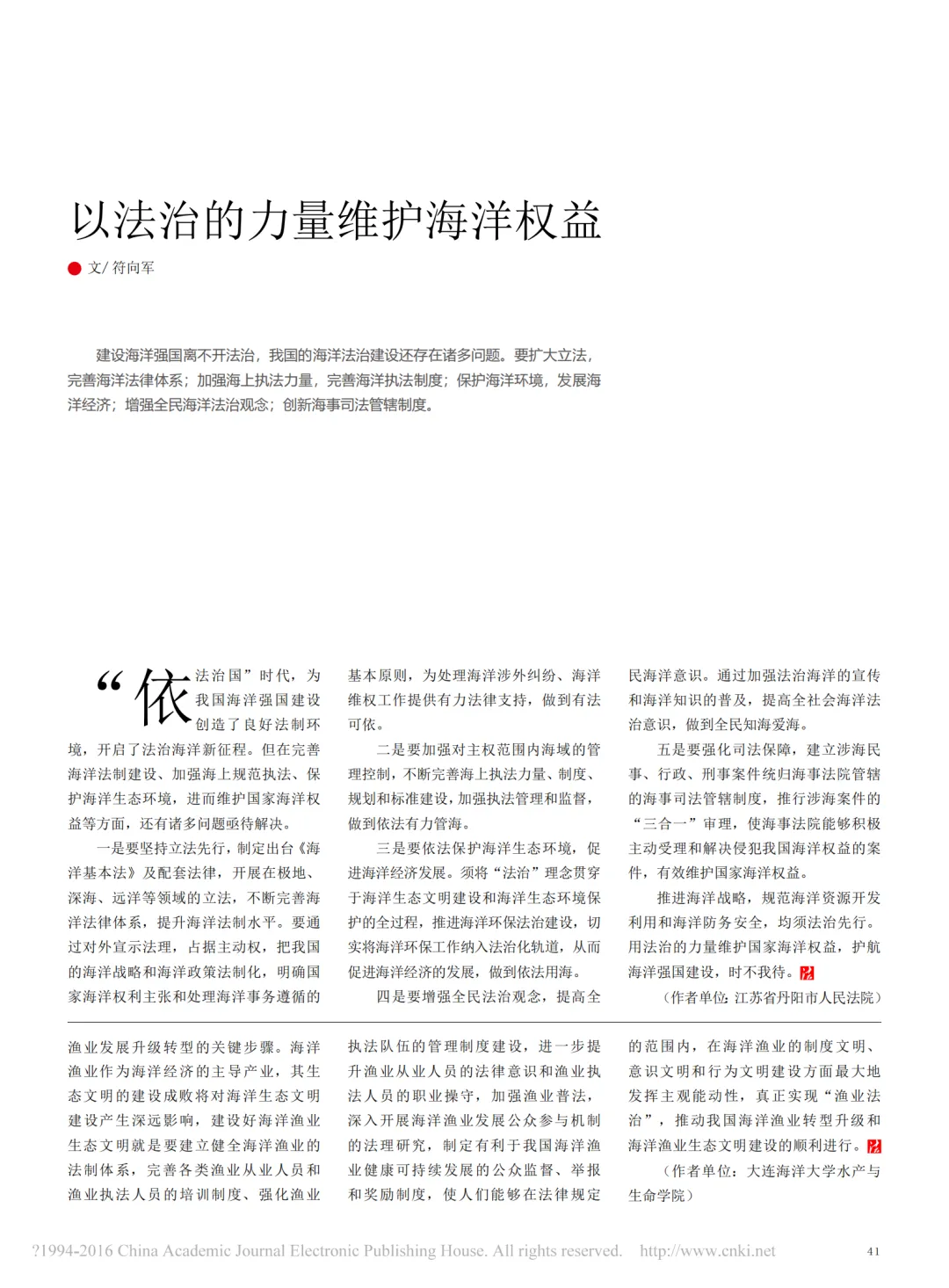 在当今形势下,只有不断加强渔业法制理论研究和立法实践,建立和完善以《渔业法》为主体,以海洋渔业资源管理制度、近岸海域综合管控制度、渔船渔港管理制度、渔政管理制度、渔业执法队伍建设制度等为重要补充的,适应我国国情和建设海洋强国战略需要的海洋渔业法制体系,才能更有效地推动和促进我国海洋渔业的健康可持续发展。