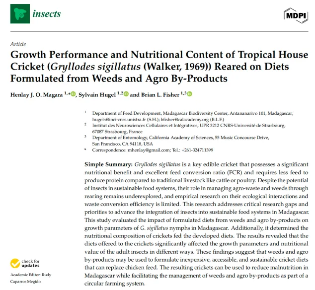 尽管昆虫在可持续食品体系中潜力巨大,但通过养殖昆虫来处理农业废弃物和杂草的相关研究仍较为欠缺。法国、美国等科学家以家蟋蟀为研究对象,在马达加斯加探究了10种由杂草和农业副产物配制的饲料(含鸡饲料对照组)对其生长性能及营养成分的影响。结果表明,混合杂草-麸皮优化饲料表现最优,可使蟋蟀发育时间缩短至48.8天、存活率达88.1%、成年体重0.44g、体长19.2mm,且饲料转化率(FCR)低至1.63,产出蟋蟀的粗蛋白含量达64.4g/100g干重,矿物质和不饱和脂肪酸含量也显著高于其他组。研究证实,杂草和农业副产物可配制出低成本、可持续的蟋蟀饲料,替代昂贵的鸡饲料,不仅能提升热带家蟋蟀的养殖效益、缓解马达加斯加的营养不良问题,还能推动循环农业体系发展,为昆虫养殖的规模化应用提供了关键数据支撑。相关结果发表于《Insects》期刊。