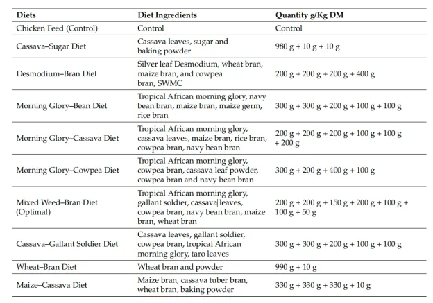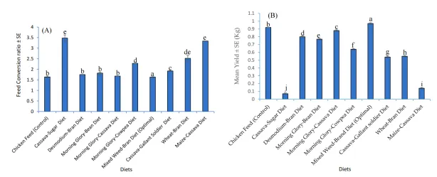 生产效率指标:饲料转化率(FCR)混合杂草-麸皮组最低(1.63),鸡饲料对照组接近(1.64),木薯-糖和玉米-木薯组最高均3.48,FCR越低表示饲料利用效率越高。混合杂草-麸皮组产量最高(0.97Kg),鸡饲料对照组次之(0.92Kg),木薯-糖组产量最低(图4)。
