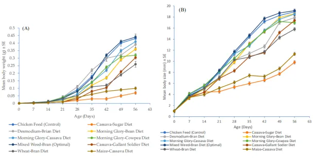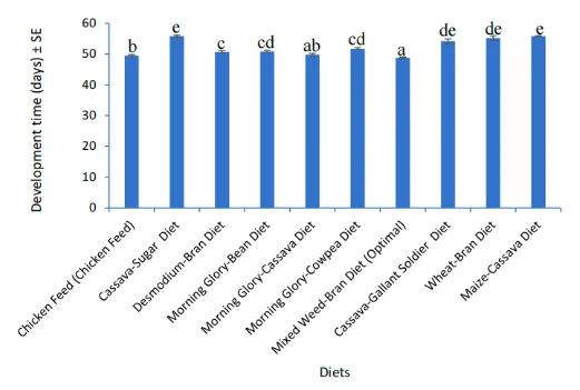 生长性能:发育时间如图1,混合杂草-麸皮组最短48.8±0.2天,鸡饲料对照组次之49.5±0.3天,木薯-糖和玉米-木薯组最长均55.8天。