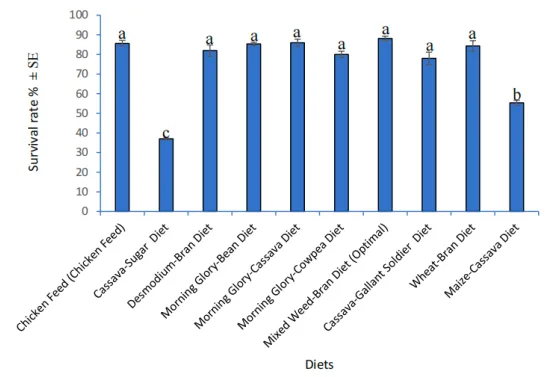 存活率如图2,混合杂草-麸皮组最高88.1%,鸡饲料对照组次之85.7%,木薯-糖组最低37%。