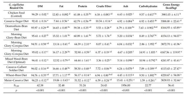 本研究发现不同杂草和农副产物饲料对热带家蟋蟀的生长性能、生产效率及营养成分均存在极显著影响(p<0.001),混合杂草-麸皮优化饲料综合表现最优,木薯-糖饲料表现最差,具体结果如下: