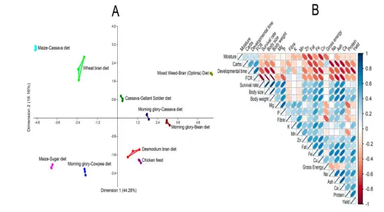 图5 饲料对热带家蟋蟀生长性能影响的多变量分析(A:多维标度分析 MDS 图;B:相关性矩阵图)