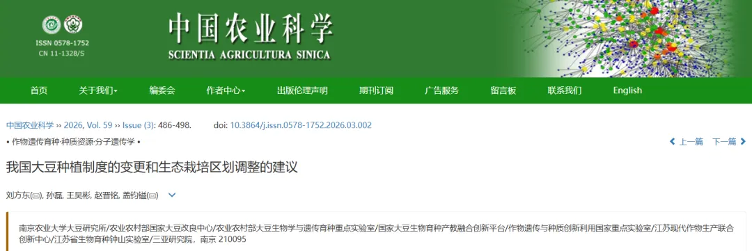 刘方东, 孙磊, 王吴彬, 赵晋铭, 盖钧镒. 我国大豆种植制度的变更和生态栽培区划调整的建议[J]. 中国农业科学, 2026, 59(3): 486-498.