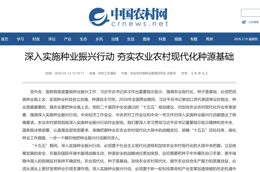 在《农村工作通讯》2026年第5期(中央一号文件专刊)中,农业农村部种业管理司司长刘莉华发表题为《深入实施种业振兴行动 夯实农业农村现代化种源基础》的文章,对“十五五”种业工作作出系统阐释。