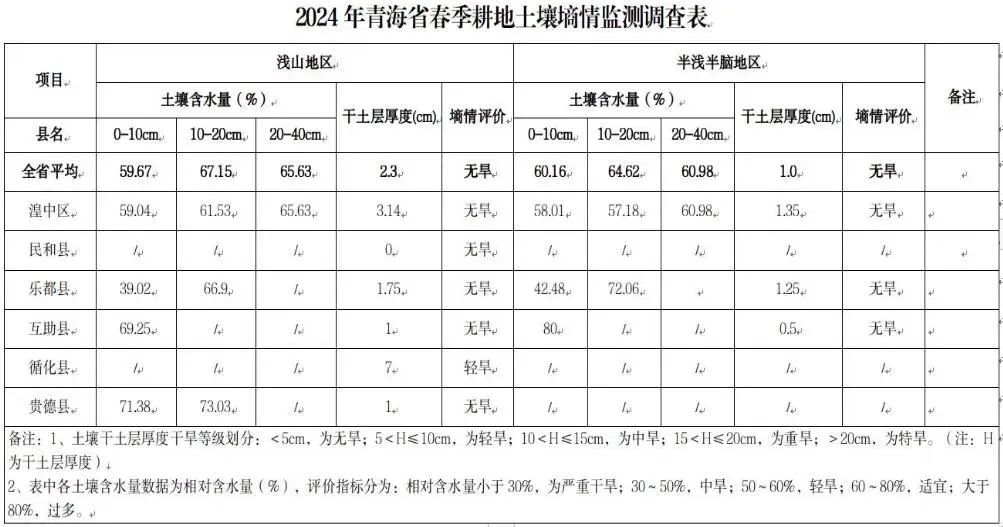 据自动墒情监测点监测结果显示:农区大部分土壤仍处于封冻状态,东部温暖农业区土壤开始解冻,浅山地区平均干土层厚度为2.3cm,0~10cm土壤含水量为59.67%,10~20cm土壤含水量为67.15%,20~40cm土壤含水量为65.63%;半浅半脑地区平均干土层厚度为1.0cm,0~10cm土壤含水量为60.16%,10~20cm土壤含水量为64.62%,20~40cm土壤含水量为60.98%;截至目前,循化县平均干土层厚度为7.0cm,预计发生轻旱,省内其余地区土壤墒情适宜。