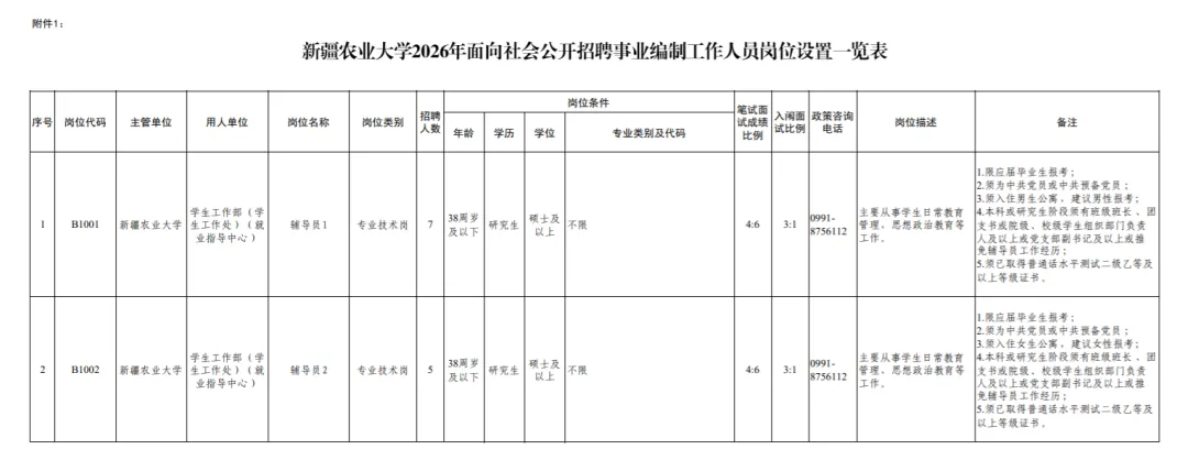 根据《事业单位人事管理条例》(国务院令第652号)、《自治区事业单位面向社会公开招聘工作人员办法》(新人社发〔2013〕141号)等有关规定,按照公开、平等、竞争、择优的原则,经新疆农业大学党委研究,决定组织实施2026年第一批面向社会公开招聘事业编制工作人员工作,本次公开招聘共计2个岗位12人。现将有关事项公告如下: