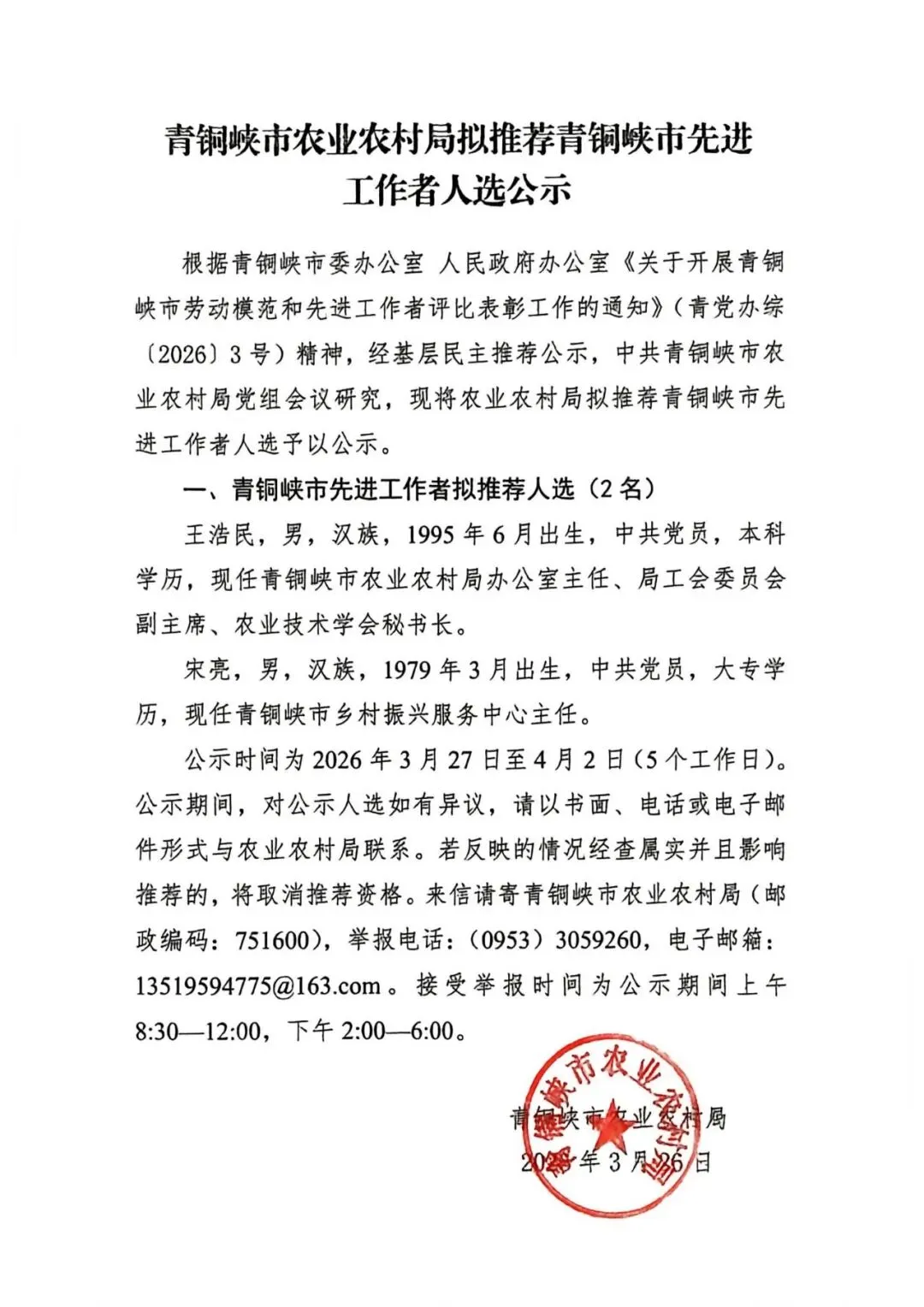 关注丨青铜峡市农业农村局拟推荐青铜峡市先进工作者人选公示