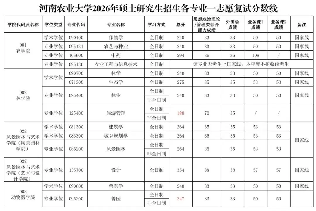 河南农业大学2026年硕士研究生招生一志愿复试分数线