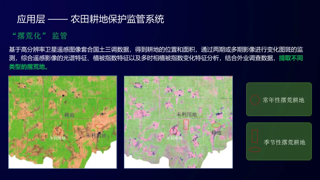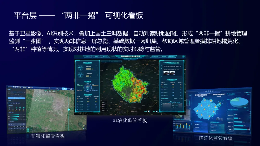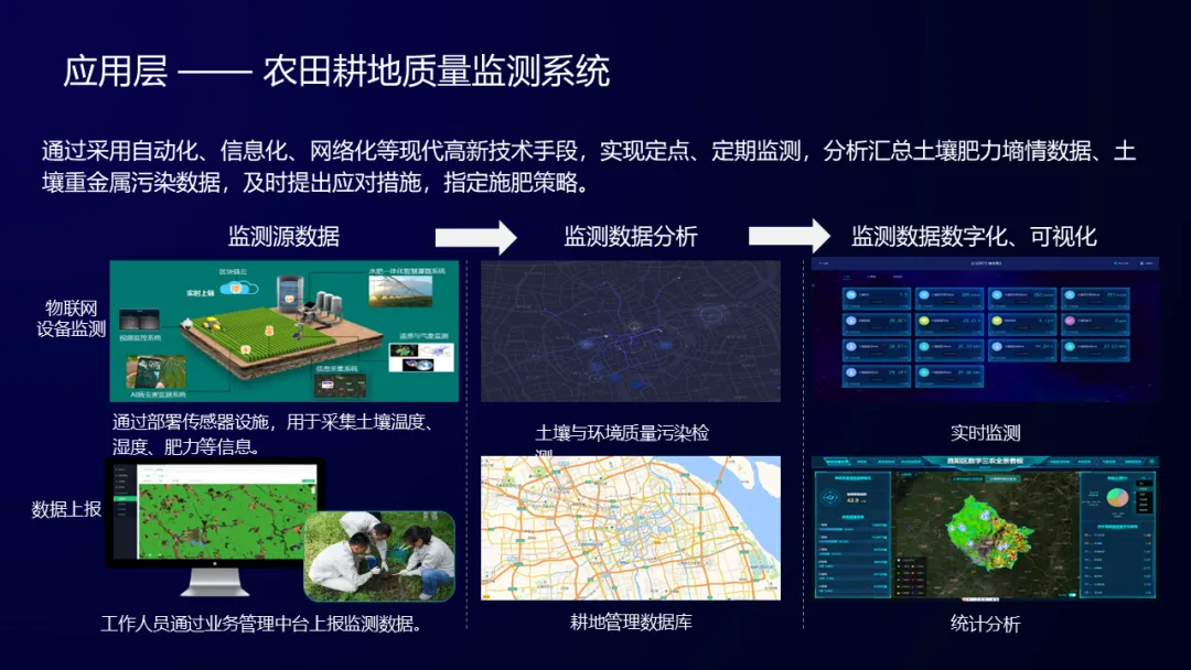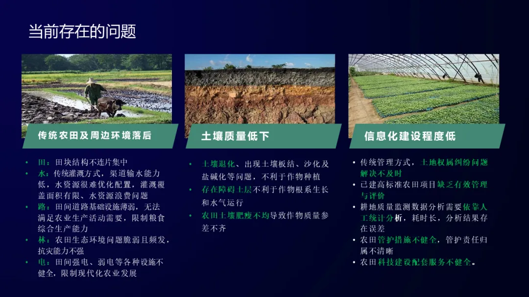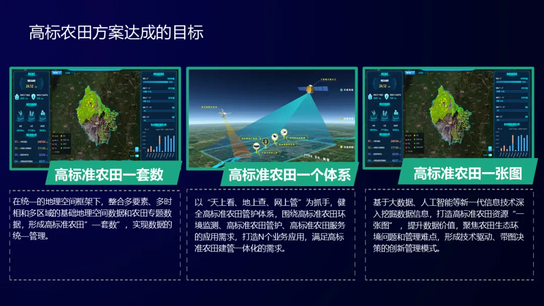 充分利用现代数字农业技术服务于农田,实现高标准农田上图入库,实现对耕地的权属、质量、环境、管护的信息化管理、全方位监测。