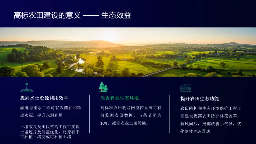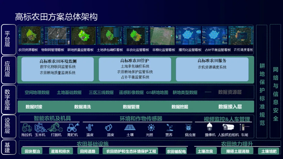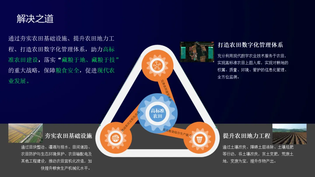 通过夯实农田基础设施、提升农田地力工程、打造农田数字化管理体系,助力高标准农田建设,落实“藏粮于地、藏粮于技”的重大战略,保障粮食安全,促进现代农业发展。