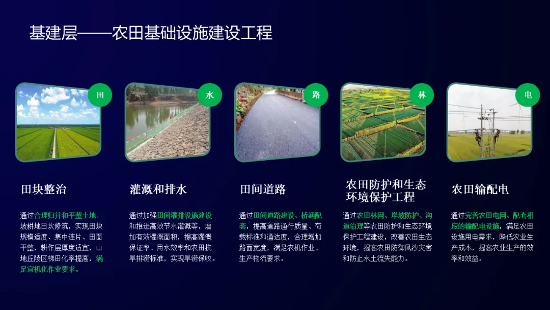 通过田块整治、灌溉与排水、田间道路、农田防护与生态环境保护、农田输配电及其他工程建设,推动农田宜机化改造,加快提升粮食生产机械化水平。