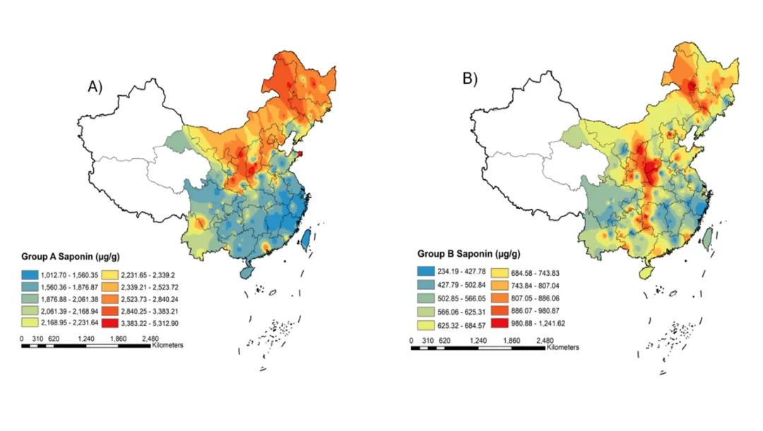 研究团队创制了大豆皂甙快速精准鉴定技术,并对711份大豆核心种质鉴定发现,籽粒皂甙总含量为1376.19–6764.67微克/克,其中皂甙A族远高于其结构中另三族,占总含量的77.5%。研究发现,大豆种皮颜色、地理来源和种质类型等显著影响皂甙含量,其中,黑种皮大豆含量最高,且以下胚轴最丰;中国东北和黄淮海地区总含量显著高于南方地区。进一步分析发现,皂甙含量分别与油分含量和蛋白质含量呈显著正、负相关。据此,研究团队筛选出15份高皂甙种质,其中特用大豆“吉育108”皂甙含量近7000微克/克,较普通品种高2-3倍。该研究为高皂甙大豆分子育种提供理论基础和关键新种质。
