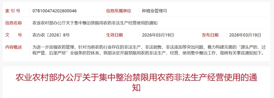 近年来,农药行业面临非法生产、销售,以及隐性成分添加等突出问题,加剧农药市场恶性竞争和行业内卷,增加安全隐患,损害了农药行业和消费者合法权益;特别是非法生产、销售禁限用农药,给农产品质量安全带来较大风险,需高度重视、集中整治、严厉打击。