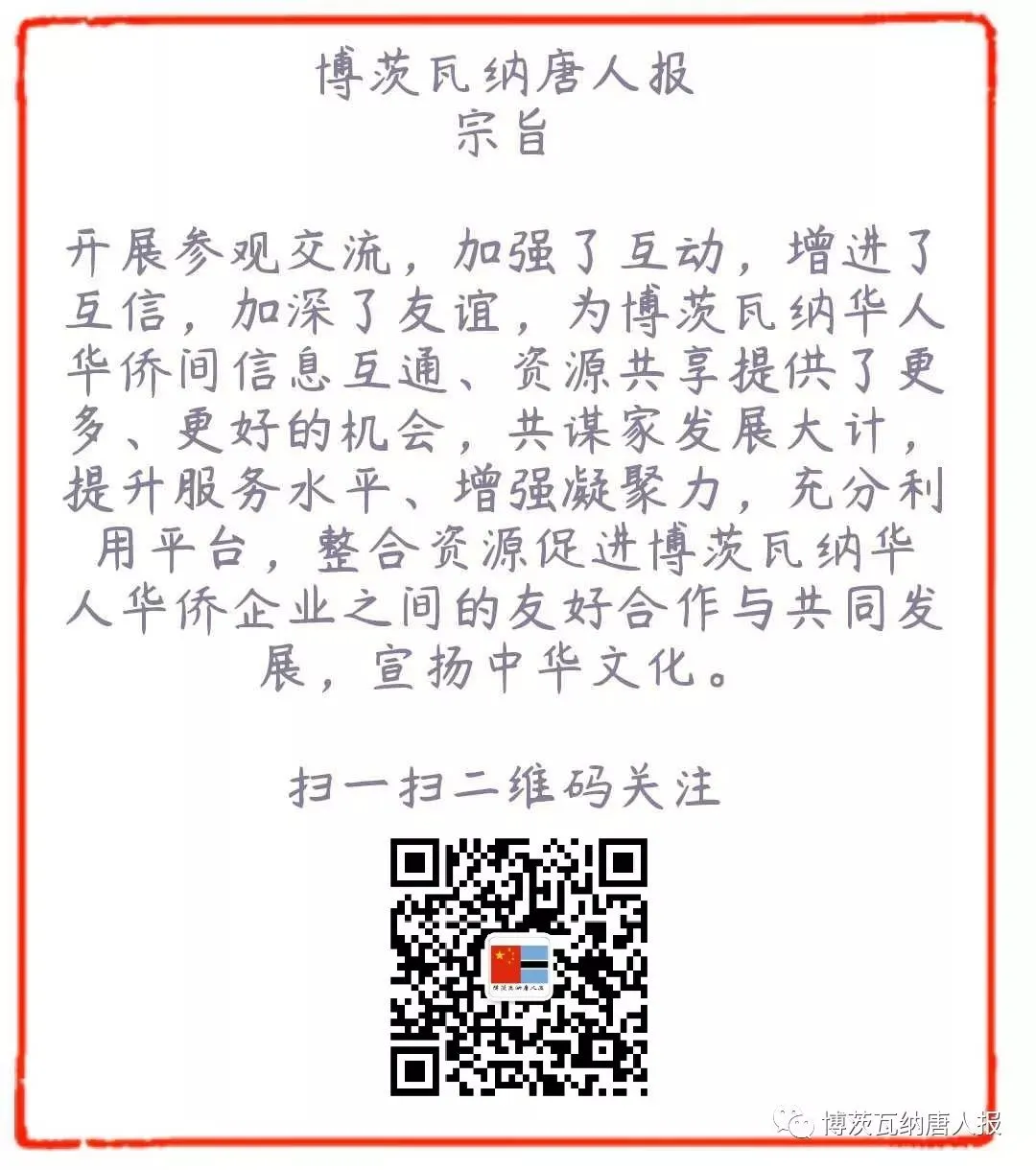 博茨瓦纳唐人报是一家非盈利机构,以翻译还原博茨瓦纳本土报社新闻资讯,来帮助华人华侨更好的了解博茨瓦纳正在发生的事情和一些国家政策。希望广大华人华侨如果有本土新闻资讯,可以投稿给报社,携手同行共同创造属于我们的未来。