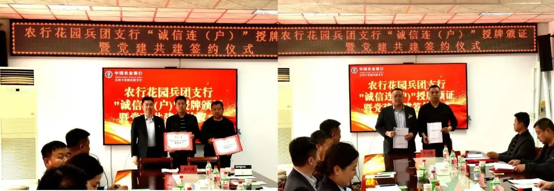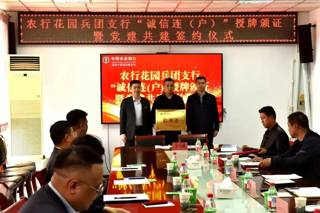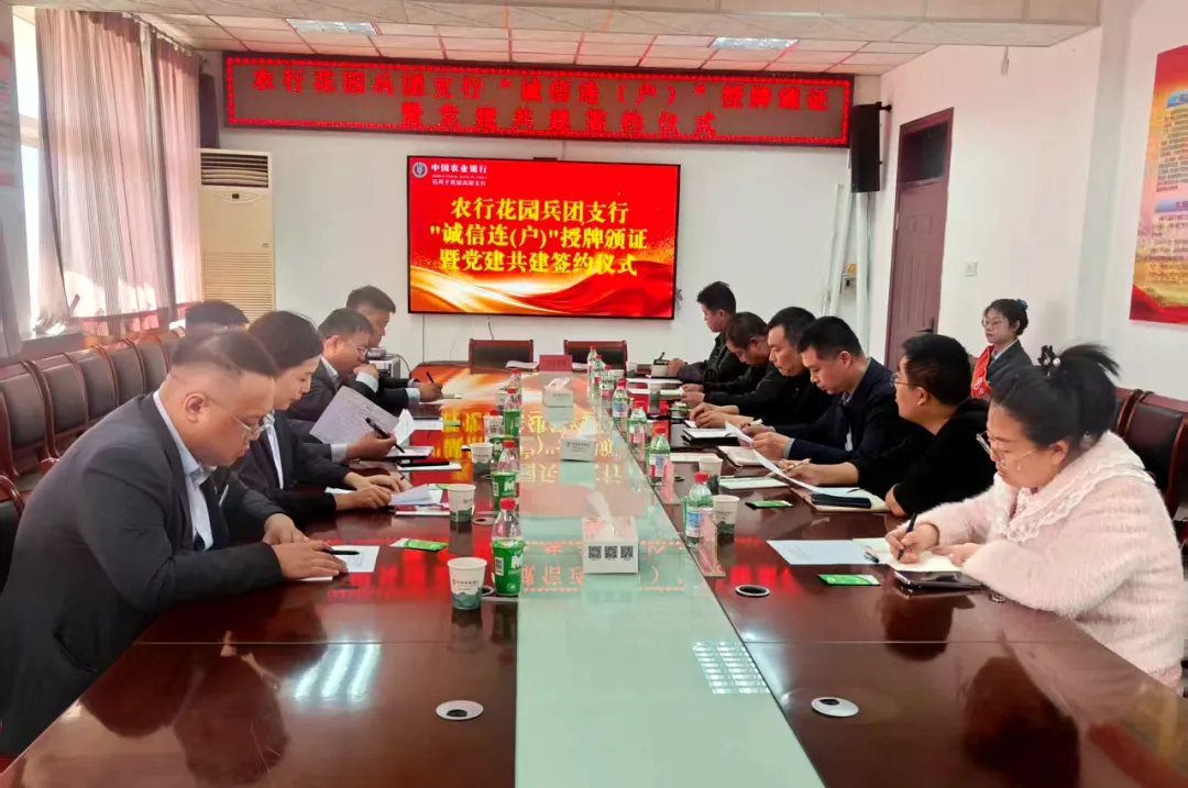 3月27日,中国农业银行石河子兵团分行党委委员、副行长陈光一行来142团,举行农行花园兵团支行“诚信连(户)”颁证仪式暨农业银行新安镇支行和142团21连党建共建签约仪式,团党委常委、副团长刘琦,团农业和林业草原中心工作人员,21连“两委”和诚信职工代表参加了会议。
