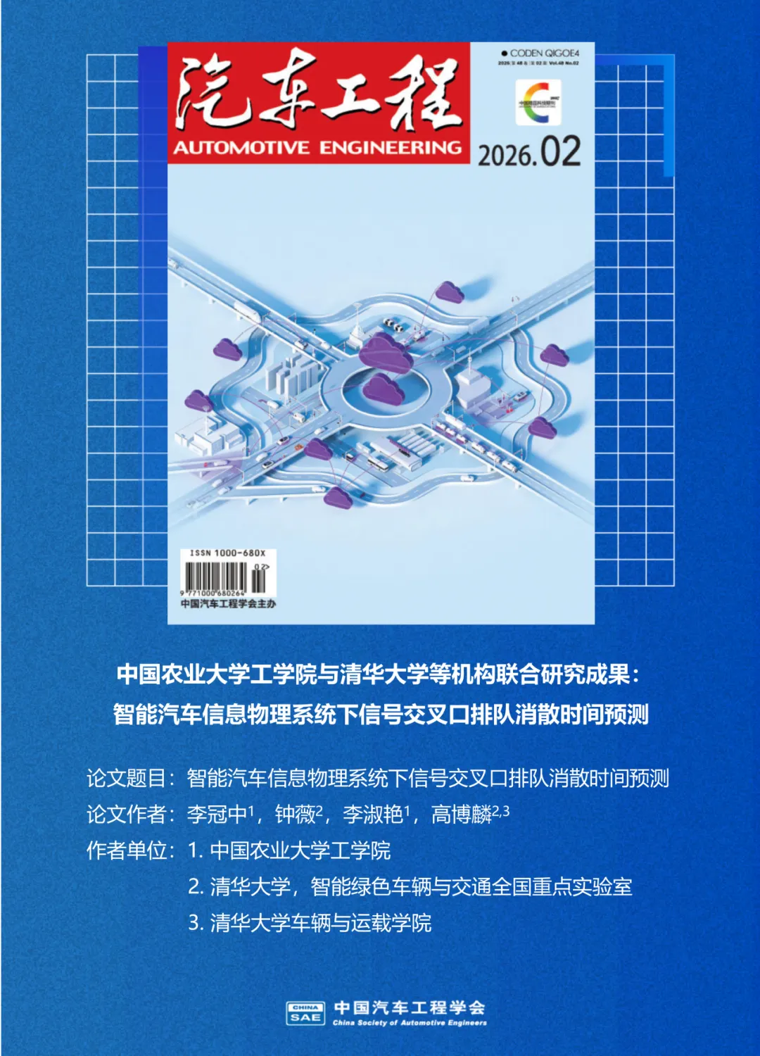 《汽车工程》2026年第2期发表了中国农业大学工学院与清华大学智能绿色车辆与交通全国重点实验室等机构联合研究成果"智能汽车信息物理系统下信号交叉口排队消散时间预测"一文。围绕绿波通行效率提升这一智能交通核心需求,针对信号交叉口排队消散时间预测中存在的动态复杂性与模式异质性难题,系统构建了融合模式识别与堆叠泛化的高精度预测模型。针对现有研究多依赖单一变量或同质性假设、难以充分利用智能汽车信息物理系统(IVCPS)多源感知优势的现状,文章从信息物理系统跨层协同视角出发,提出"模式识别—参数匹配—集成预测"的分层建模框架,为动态信号配时与绿波车速规划提供可靠的预测支撑。