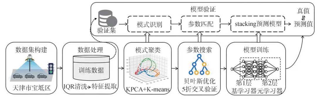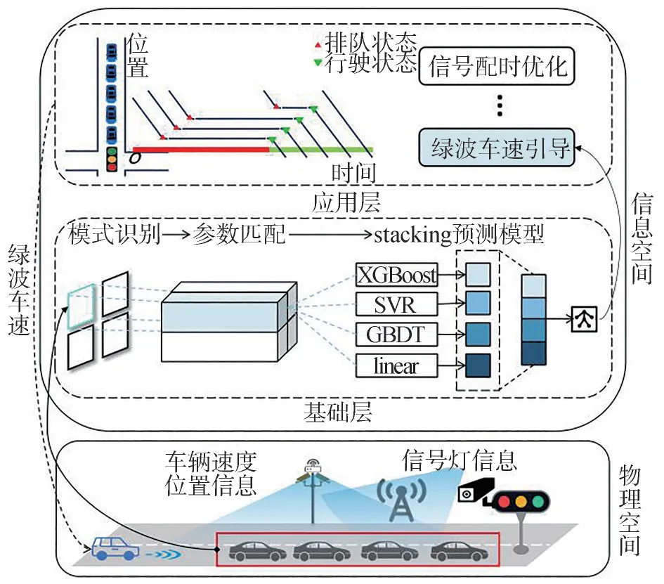 绿波通行效率高度依赖于交叉口排队消散时间的精准预测,而该过程具有动态复杂性与模式异质性。预测失准会导致车辆提前到达队尾、被迫减速甚至停车,从而降低通行效率并增加能耗。智能汽车信息物理系统(IVCPS)具备多源交通感知与实时计算能力,为在信息空间中构建高精度预测模型提供了条件。然而,现有排队消散预测方法普遍受限于输入变量不足和同质性假设,难以充分发挥IVCPS的潜在优势。基于此,文章从IVCPS架构下的信息空间基础层部署视角出发,提出融合模式识别与堆叠泛化的排队消散时间预测模型PRISM,为绿波车速引导与信号配时优化等应用层功能提供高精度输入。