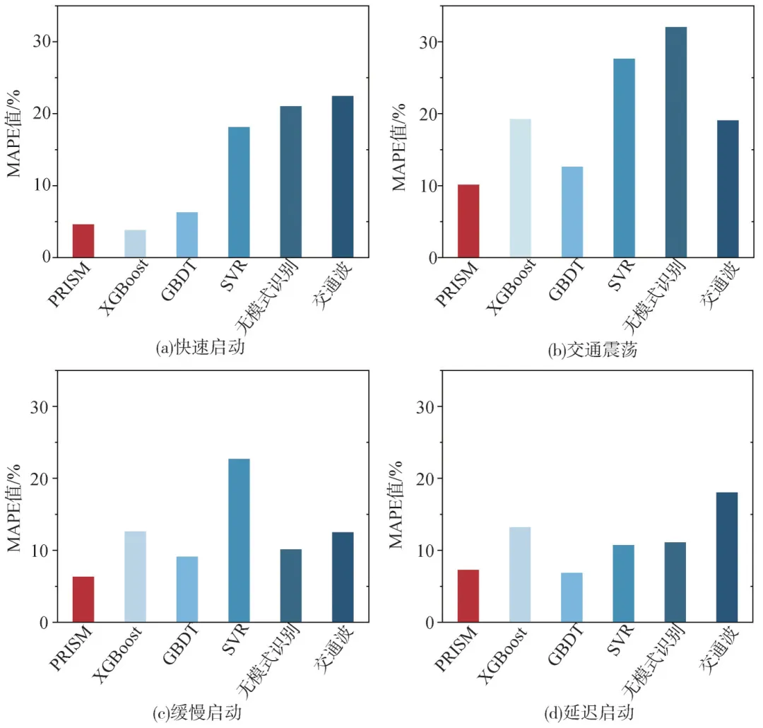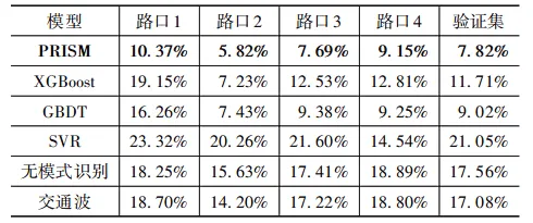 3. 与单一学习器(XGBoost、GBDT、SVR)、未进行模式识别的stacking模型以及传统交通波方法相比,PRISM的预测精度分别提升3.89%、1.20%、13.23%、9.74%与9.26%,验证了模式识别与参数匹配策略的有效性。