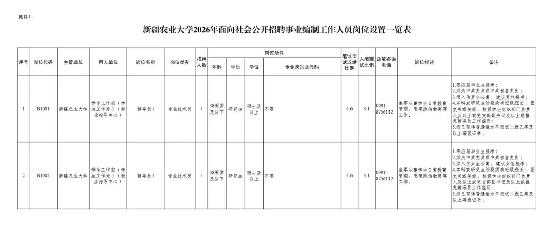 附件1:新疆农业大学2026年面向社会公开招聘事业编制工作人员岗位设置一览表.pdf