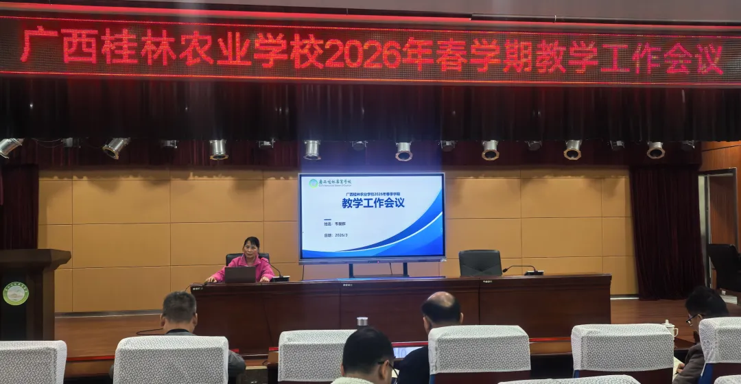 3月25日,广西桂林农业学校在综合楼五楼多功能厅召开2026年春学期教学工作会议。会议由学校教务科科长韦爱群主持,学校党总支书记、校长班祥东,副校长吴建成、张伟及全体教学人员参加。