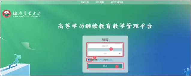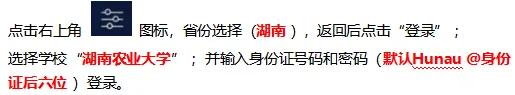 选择学校“湖南农业大学”;并输入身份证号码和密码(默认Hunau@身份证后六位)登录。