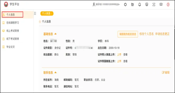 3、个人信息:可查看学生个人信息,核对本人基本信息,如有问题可申请信息更正、学籍异动。(见下图)