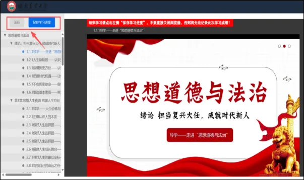 (4)结束学习前,请点击左侧“保存学习进度”后。点击返回,点击实时计算按钮,即可刷新成绩。(见下图),切记不要直接关闭窗口。