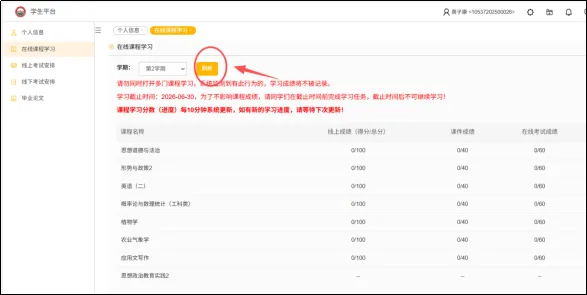 5、课件学习完成后,返回主界面。点击学期旁的“刷新”按钮 ,同步学习进度。(见下图)
