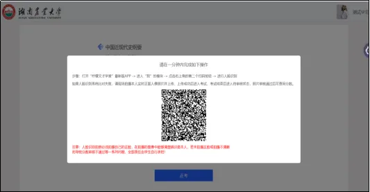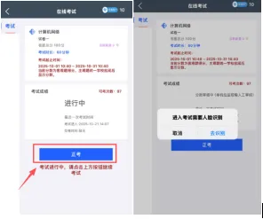 (2 )点击“正考”进入考试,根据提示完成人脸识别,识别成功后即可参与考试