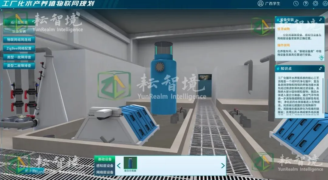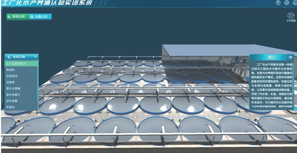 工厂化水产养殖认知实训系统,以沉浸式体验,帮助用户认知循环水养殖工厂的构成与运行原理,并融入物联网规划教学实训。系统集成3D模型展示、设备拆装、智慧渔业拓扑规划、组网及故障排查等功能,强化实操能力与学习体验。