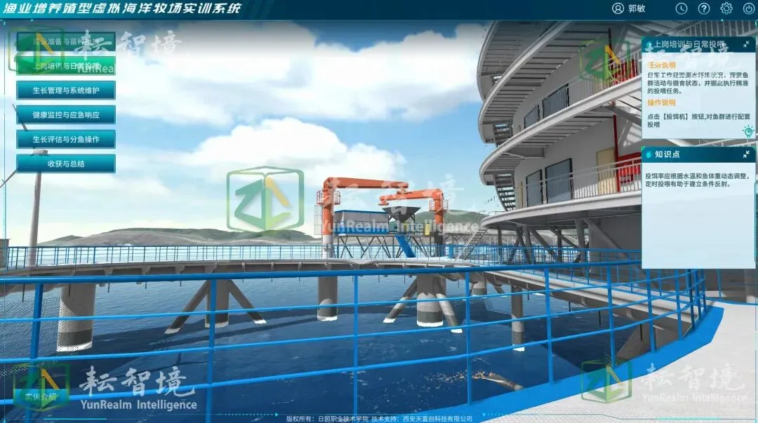 智慧虚拟水产养殖实训系统,打造了一个高度仿真的渔业养殖环境,集成水质监测、智能投喂、增氧调控等物联网设备操作,模拟了从苗种繁育、水质调控、投喂、疾病防治到捕捞全流程实训,帮助用户掌握现代渔业设备应用、疾病预防及标准化养殖技术,提升实操能力。