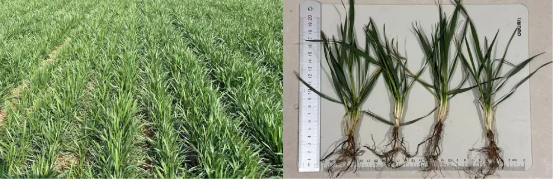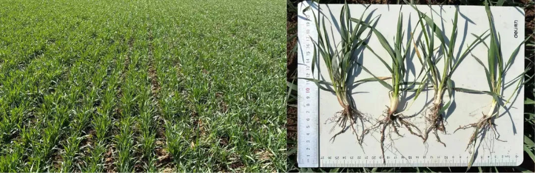 贾家口镇小刘村:小麦品种为‘马兰1号’,2025年10月30日采用15cm等行距播种,播量22.5kg/亩。冬前未镇压,未浇灌冻水。目前小麦个体6叶1心,总茎数113.4万/亩,分蘖4.4个、次生根6.3条,为一类壮苗。当前墒情适宜,未发现病虫害。