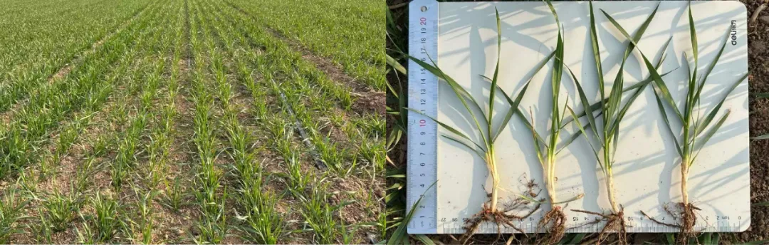4.友谊路:小麦品种为‘众岱100’,2025年11月1日采用15cm等行距播种,播量为22.5 kg/亩。冬前进行了镇压,冬前灌溉冻水。群体总茎数184.9万/亩,小麦个体5叶1心,分蘖2.8个,次生根5.3条,为一类壮苗。土壤墒情较好,田间未发现病虫草害。