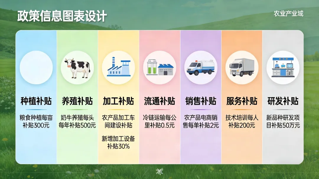 - 核心补贴:合作社/家庭农场能力提升补贴+农业龙头企业专项补贴,配套经营主体培育资金池,强化联农带农效应。