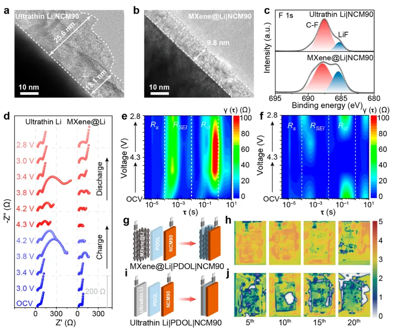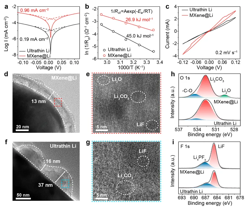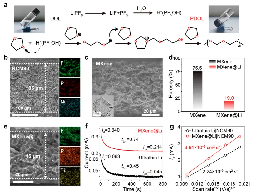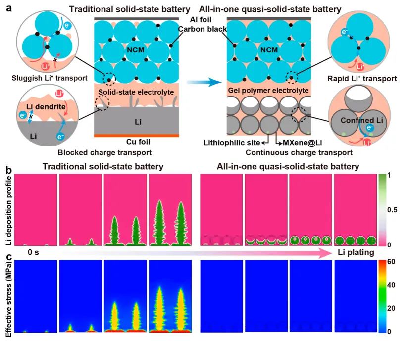 准固态锂金属电池(QSSLMBs)凭借超高理论能量密度(超 500 Wh kg⁻¹),成为下一代储能技术的核心候选。然而,其实用化面临严峻的界面瓶颈:固态 - 固态接触的刚性特性导致反应区域受限、活性物质利用率低;锂金属阳极在循环中体积变化剧烈,产生显著机械应力,引发界面剥离、阻抗升高;传统平面接触几何限制离子传输,导致锂沉积 / 剥离局部化,加剧枝晶生长与电池失效。尤其在高载量、高电流密度工况下,这些问题更为突出,现有界面工程策略难以兼顾动态体积适配、枝晶抑制与高效电荷传输,严重制约高能量密度 QSSLMBs 的开发。现有研究多通过涂层修饰或聚合物中间层改善界面润湿性,但无法适应长期循环中的动态体积变化;一体化架构设计虽能实现无缝接触,却存在机械性能差、锂亲和性不足等缺陷,未能解决锂沉积过程中的应力管理问题。本研究创新性地提出离子电子混合网络凝胶电解质 - 阳极一体化策略,通过原位聚合将凝胶电解质(PDOL)浸润到三维中空MXene/Li 支架中,构建兼具离子与电子导电性的复合阳极。该结构借助MXene表面亲锂位点与弯曲孔道几何,引导锂均匀沉积于内部空腔,同时缓冲体积变化、抑制枝晶生长;连续的电荷传输网络加速反应动力学,适配高载量正极。基于该策略,对称电池稳定循环超 1750 h,LiFePO₄全电池 1C 循环 1000 次容量保持率 72.6%,高载量 NCM90 正极软包电池能量密度达 392 Wh kg⁻¹,13 层堆叠电池预计能量密度 561 Wh kg⁻¹,为高性能 QSSLMBs 提供了可行路径。①结构设计创新:首次构建 “凝胶电解质 - 三维MXene/Li 支架” 一体化复合阳极,实现离子电子双导电网络协同,突破传统电极与电解质分离设计的局限,兼顾动态体积适配与高效电荷传输;②作用机制创新:MXene支架的亲锂位点降低锂成核过电位,中空孔道空间限域锂沉积,缓解机械应力;PDOL 凝胶电解质与电极无缝融合,形成稳定界面,同时MXene的高导电性与凝胶的离子传输能力协同提升反应动力学;③实用化突破:适配高载量(31.5 mg cm⁻²)高镍正极,软包电池能量密度与循环稳定性创同类报道新高,且具备柔性与可折叠特性,兼顾高能量密度与长循环寿命,适配实际应用需求。图 1. (a) 传统固态电池与一体化准固态电池的界面接触、离子 / 电子传输及锂沉积行为示意图;(b) 锂沉积形貌的相场模拟演化;(c) 传统超薄锂阳极与MXene@Li阳极的有效应力模拟。①传统电池缺陷:平面接触导致离子传输迟缓,锂沉积局部化引发枝晶生长与界面应力集中,最终导致界面剥离与电池失效;②一体化设计优势:MXene@Li复合阳极提供连续离子 / 电子传输通道,亲锂位点与孔道结构引导锂均匀沉积于内部空腔,避免枝晶形成;凝胶电解质与电极无缝融合,消除界面间隙,同时缓冲体积变化,缓解机械应力;③模拟验证:相场模拟证实,一体化结构中锂沉积更均匀,有效应力显著低于传统结构,证实应力管理与枝晶抑制的协同效果。图 2. (a) LiPF₆引发 DOL 原位聚合示意图;(b) PDOL 凝胶电解质 / NCM90 正极截面 SEM 图像;(c) MXene框架 SEM 图像(插图为MXene TEM 图像);(d) MXene与MXene@Li的孔隙率测试;(e) PDOL 凝胶电解质 / MXene@Li阳极截面 SEM 及 EDS 元素 mapping;(f) 锂离子迁移数测试的计时电流曲线;(g) 超薄 Li|NCM90 与 MXene@Li|NCM90 全电池的峰电流与扫速平方根线性关系。①制备工艺:LiPF₆分解产生的酸性物种引发 DOL 原位开环聚合形成 PDOL 凝胶电解质,同时浸润MXene框架与 NCM 正极,实现电极 - 电解质无缝融合;MXene框架经 Ag 纳米粒子修饰增强亲锂性,电镀锂后形成MXene@Li复合阳极,保留 19.0% 孔隙率,平衡离子可及性与结构稳定性;②结构特征:EDS mapping 证实 F、P 元素在MXene@Li阳极与 NCM 正极中均匀分布,表明凝胶电解质充分浸润;MXene@Li阳极的锂离子迁移数达 0.74,远高于超薄 Li 阳极(0.45),锂离子扩散系数(3.64×10⁻⁹ cm² s⁻¹)为传统结构的 2 倍;③电荷传输优势:线性扫描结果证实,一体化结构中电荷传输动力学显著提升,为高载量工况下的高效反应奠定基础。图 3. (a) 超薄 Li 与MXene@Li对称电池的塔菲尔曲线;(b) 两种对称电池的活化能测试;(c) 两种对称电池的 CV 曲线;(d-e) 循环后MXene@Li阳极的 HRTEM 图像;(f-g) 循环后超薄 Li 阳极的 HRTEM 图像;(h-i) 循环后两种阳极的 O 1s 与 F 1s XPS 图谱。①传输动力学:MXene@Li对称电池的交换电流密度(0.96 mA cm⁻²)为超薄 Li 电池(0.19 mA cm⁻²)的 5 倍,活化能(26.9 kJ mol⁻¹)显著低于超薄 Li 电池(45.0 kJ mol⁻¹),证实界面电荷转移阻力更低、离子传输效率更高;② SEI 层特性:MXene@Li阳极表面形成均匀的Li₂O/Li₂CO₃/LiF-rich 混合 SEI 层,结构致密、离子导电性优异;而超薄 Li 阳极的 SEI 层不均匀,有机成分占比高,离子传输阻力大;③反应可逆性:MXene@Li电池的 CV 曲线电流响应更高、电压滞后更小,表明锂沉积 / 剥离反应的可逆性与界面稳定性更优。图 4. (a-b) 超薄 Li|NCM90 与 MXene@Li|NCM90 全电池循环后 NCM90 正极 CEI 层的 HRTEM 图像;(c) 循环后 NCM90 正极 CEI 层的 F 1s XPS 图谱;(d) 两种全电池的原位 EIS 图谱;(e-f) 对应的 DRT 轮廓图;(g-h) MXene@Li|NCM90 软包电池结构及循环过程中原位超声透射图像;(i-j) 超薄 Li|NCM90 软包电池结构及循环过程中原位超声透射图像。① CEI 层优化:MXene@Li体系中 NCM 正极表面形成薄而均匀(~10 nm)的 CEI 层,富含LiF与Li₃PO₄无机成分,防护效果优异;而超薄 Li 体系的 CEI 层厚且不均匀(~30 nm),有机成分占比高,结构稳定性差;②阻抗演