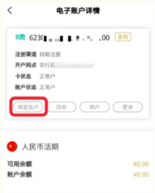 如果钱在农行一类卡,可以先查农行一类卡转二类卡限额,有额度的话,可以换绑二类卡关联账户到农行卡,选择更改绑定账户:我的账户➜电子账户详情➜更改绑定账户➜换绑成农行一类卡。