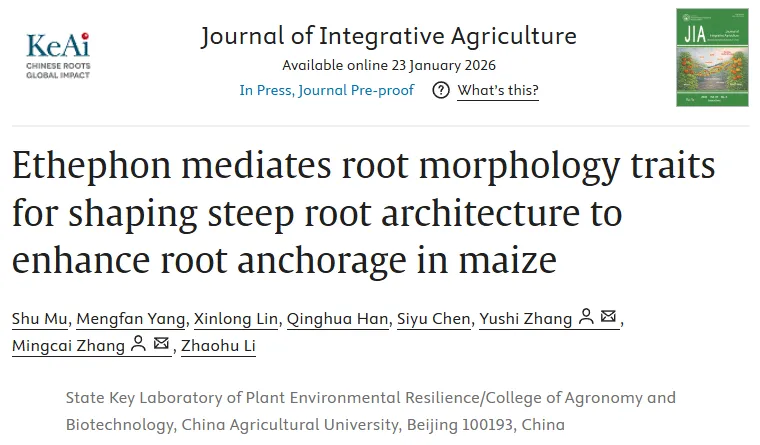Shu Mu, Mengfan Yang, Xinlong Lin, Qinghua Han, Siyu Chen, Yushi Zhang, Mingcai Zhang, Zhaohu Li. 2026. Ethephon mediates root morphology traits for shaping steep root architecture to enhance root anchorage in maize. Journal of Integrative Agriculture, Doi:10.1016/j.jia.2026.01.031