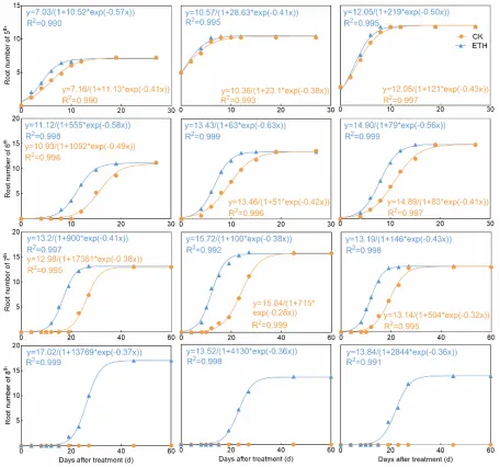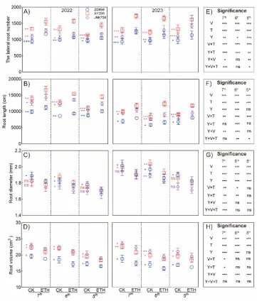 结果表明,乙烯利处理可提早节根的发育起始时间、加快节根发育速率、缩短根层发育时间,诱导形成额外一层节根但不显著影响各层的节根数量。同时,乙烯利处理显著增加了玉米根系总长和侧根数量,但降低了根平均直径和根体积。此外,乙烯利处理增加了根夹角、根顶角和根底角,减小了根系最大宽度和中位宽度,从而形成了更加陡直紧凑的根系构型。