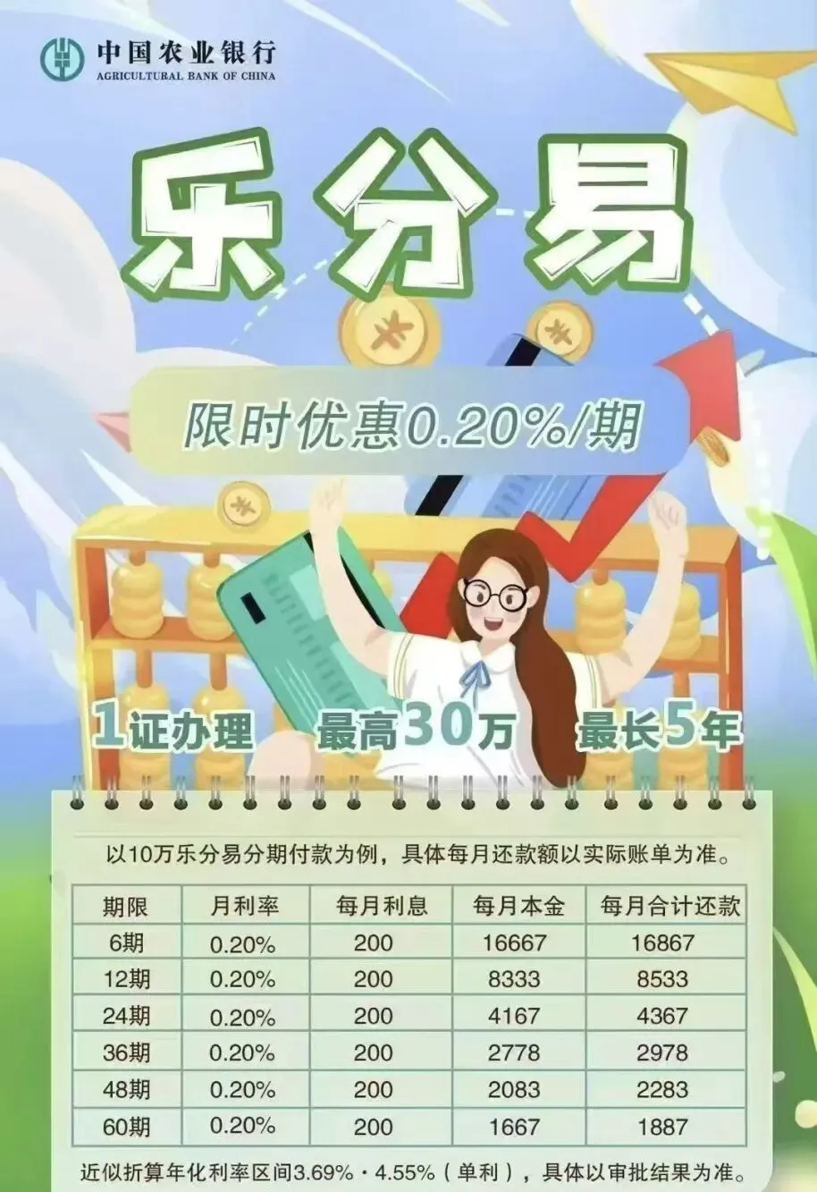 乐分易是农业银行推出的一款针对按揭房与公积金客户的一款信贷产品,只要你有按揭在农业银行的房产或公积金基数5000以上,可线下申请最高 100 万,最长5年的贷款。