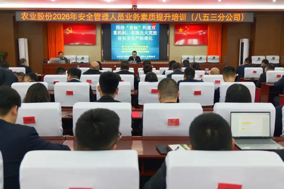 为全面提升安全管理人员的专业素养与履职能力,3月27日,农业股份2026年安全管理人员业务素质提升培训在八五三分公司成功举办。此次培训以“以标促建强素养,筑牢防线保安全”为目标,旨在通过标准化建设强化安全管理队伍能力,为企业安全生产筑牢坚实屏障。