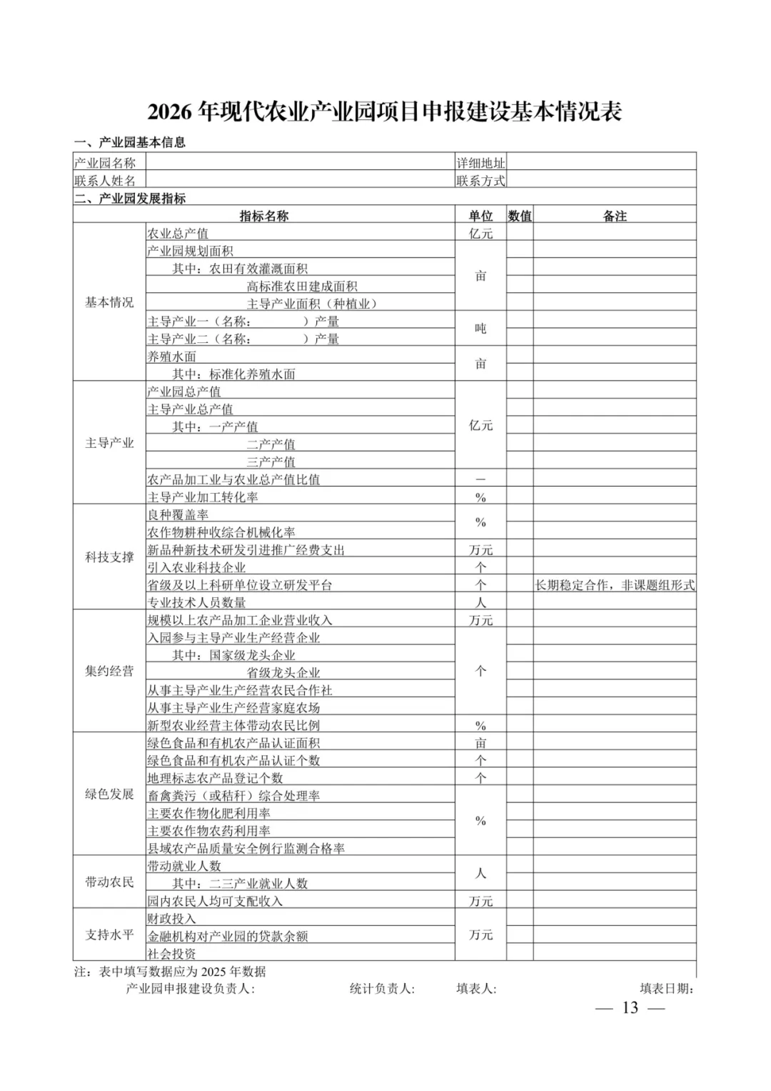 各地应在前期项目储备工作基础上,严格按照《2026年农业产业融合发展项目申报指标表》 (附件1)进行申报,超出指标的一律不予受理。 申报指标:一是基础性指标。 主要根据农林牧渔业总产值、粮油总产量以及绩效评估结果等因素分配各省份。 二是政策性指标。 综合考虑产业布局优势和地方实际,黑龙江、河南、山东、安徽、内蒙古可各申报1个粮食产业园,且申报指标应优先安排产粮大县;四川、湖北、湖南可各申报1个油料产业园。 同时,实行申报指标与审计监督、绩效评估、前期储备情况相挂钩,对乡村产业融合发展专项审计发现问题突出的省份、近年来项目绩效评估通过率低的省份,相应扣减申报指标。