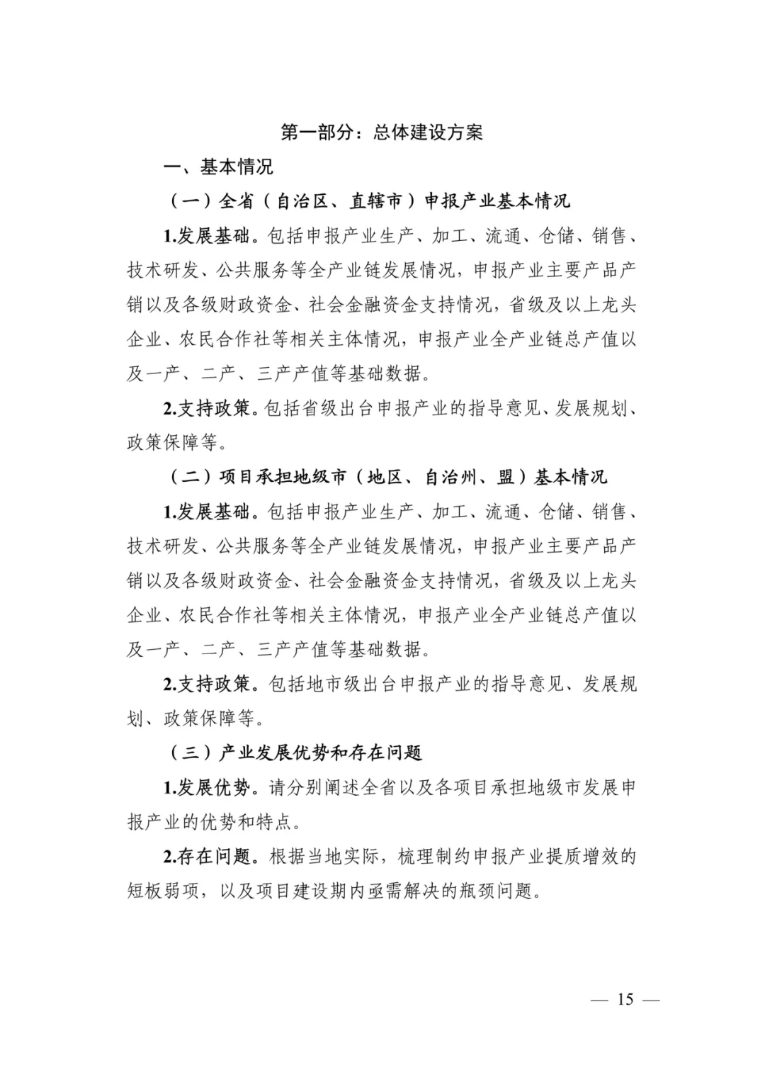 各地应在前期开展农业产业融合发展项目储备的基础上,按照竞争择优的原则确定申报项目。 现代农业产业园,各省份应至少申报1个重点品类项目,且申报产业园农业全产业链产值应达到20亿元,全部作为竞争遴选项目申报。优势特色产业集群,各省份应向重点品类聚焦,全部作为竞争遴选项目申报。 原则上2024年农林牧渔业总产值超过4000亿元的省份,申报产业全产业链产值应达到100亿元;低于4000亿元的省份,申报产业全产业链产值应达到80亿元(新疆、西藏应达到50亿元) 。 各省优势特色产业集群项目应合理布局、适度集中,覆盖区域不超过两个地级市,有条件的可集中在一个地级市布局申报。 农业产业强镇,原则上东、中、西部地区镇域申报主导产业全产业链产值应分别达到2亿元、1.5亿元和1亿元,采取地方择优竞争、部级层面组织书面审查的方式开展申报,并将抽取50%左右比例的项目采取答辩等方式进行复核。