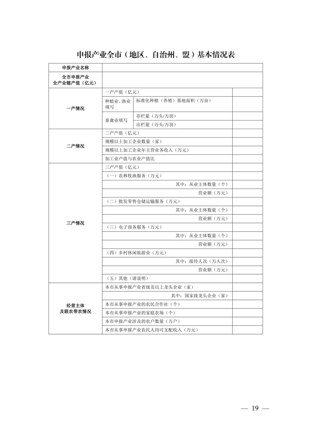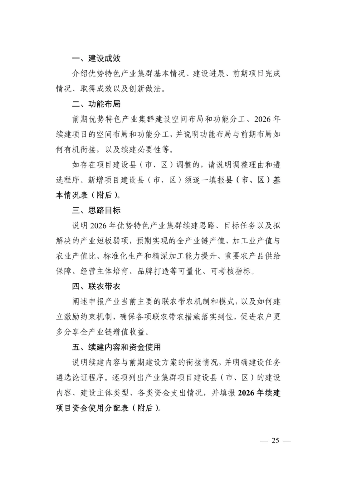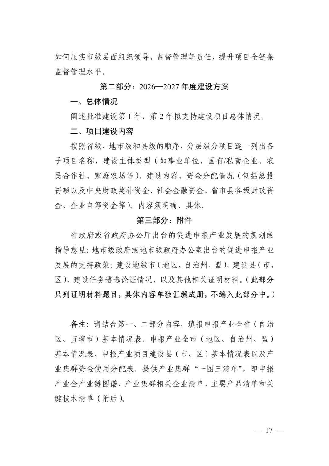 申报材料应包括申报函和现代农业产业园、优势特色产业集群和农业产业强镇分项申报材料。 其中,现代农业产业园分项材料包括产业园建设方案、产业园建设基本情况表等(见附件2) ;优势特色产业集群分项材料包括产业集群建设方案、主导产业基本情况表、项目建设县 ( 市、区) 基本情况表、资金使用分配表以及2022—2024年批准建设且2026年延续支持的产业集群续建方案等(见附件3) ;农业产业强镇分项材料包括省级推荐名单、建设申报表、建设方案和相关附件证明材料(见附件4) 。