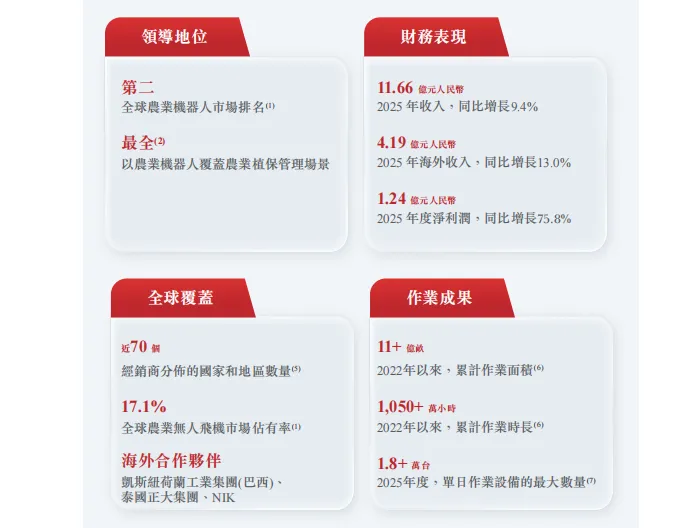 根据弗若斯特沙利文的资料,以2024年收入计算,极飞科技在全球农业机器人市场中占据10.7% 的份额,排名全球第二;在全球农业无人机市场占据17.1% 的份额,同样排名第二。