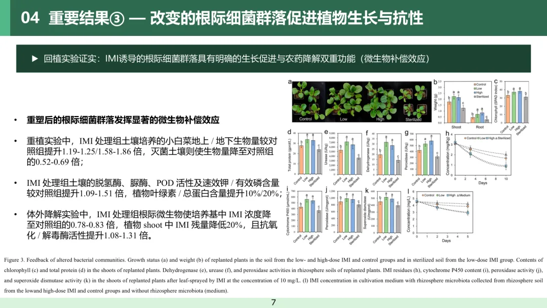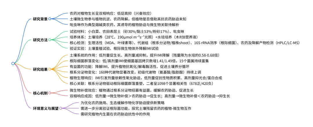 本研究以吡虫啉为模式农药,系统阐释了农药施用量、植物生长与根际细菌群落三者间的关联。在此基础上,本研究验证了根际细菌对植物生长和农药降解的补偿效应,同时探究了这类细菌与根系分泌物代谢物之间的调控关系。随后,研究构建了一套严谨的假说以解释这一兴奋效应,该假说着重阐明了微生物补偿作用与农药剂量依赖性胁迫的联合作用机制。本研究的相关发现为优化农药施用方式开辟了新途径,为揭示植物与根际微生物群的互作规律提供了新线索,也为推动农业可持续栽培技术的发展奠定了新基础。(研究内容和解决的科学问题)