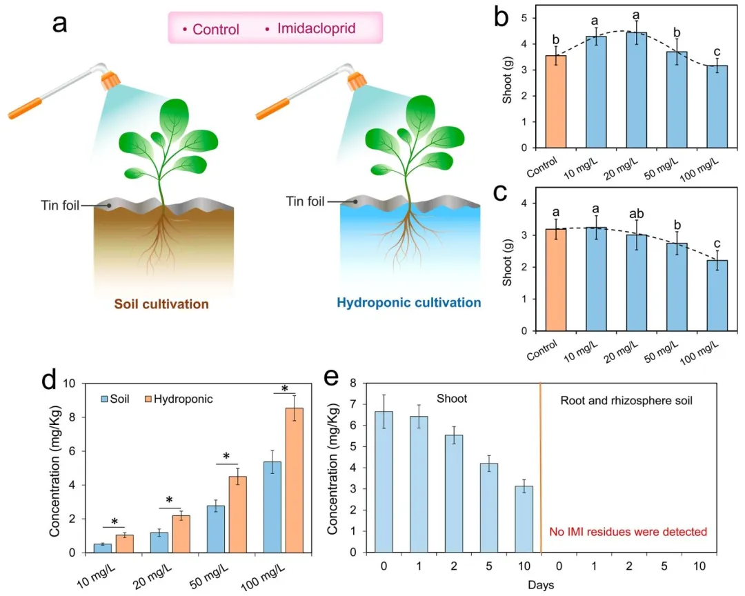 图 1 叶面喷施吡虫啉后植株的生长状况及吡虫啉残留分布(a) 试验设计;(b)~(c) 分别为土壤培养体系、水培体系下的植株生长情况;(d) 培养 20 天后植株地上部的吡虫啉残留量;(e) 土壤培养体系下,经 20 mg/L 吡虫啉叶面喷施处理的小白菜其地上部、根系及根际土壤中的吡虫啉残留量。柱形图上不同字母表示组间存在统计学显著差异(方差分析结合杜凯检验,P < 0.05)。植株生长指标测定设置 20 次重复,吡虫啉残留量测定设置 6 次重复,误差棒代表标准差。