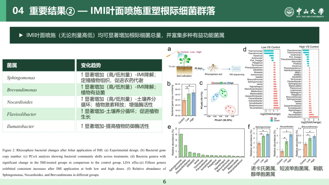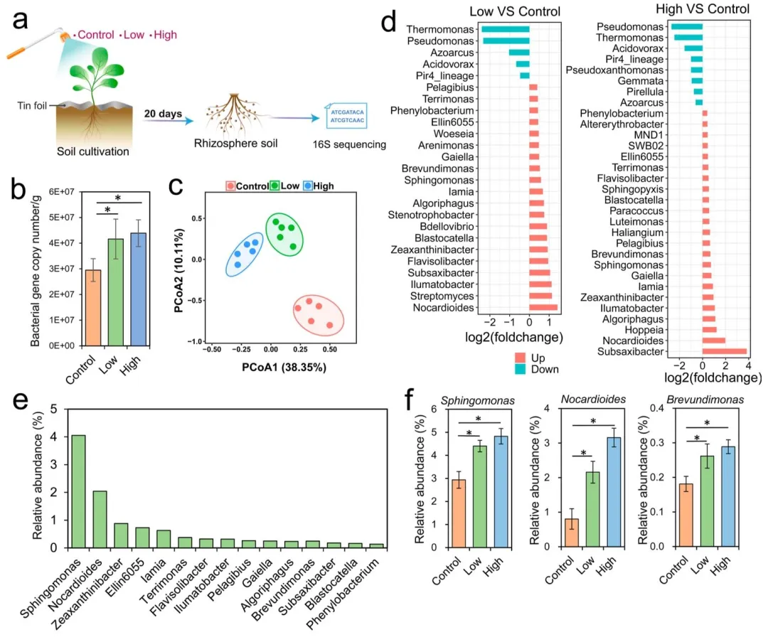图 2 叶面喷施吡虫啉后根际细菌的变化特征。(a) 试验设计;(b) 细菌基因拷贝数;(c) 主坐标分析(PCoA)展示不同处理组的细菌群落结构变化;(d) 吡虫啉处理组与对照组间存在显著差异的菌属(线性判别分析效应量法,P<0.05,线性判别分析效应量> 2);(e) 低、高剂量吡虫啉处理后均呈显著富集的 15 个菌属;(f) 不同处理组中鞘氨醇单胞菌属、诺卡氏菌属和短波单胞菌属的相对丰度。星号表示组间存在统计学显著差异(威尔科克森秩和检验,P<0.05)。柱形代表 5 次重复的平均值,误差棒代表标准差。